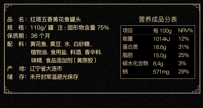 红塔五香黄花鱼罐头110克×6罐即食海鲜大连特产应急物资储备