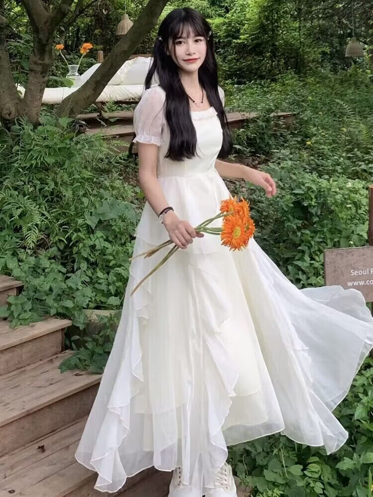 格逻恩法式连衣裙女夏季2023新款雪纺裙子夏天方领甜美温柔风仙女公主裙白色均码(可备注码数)