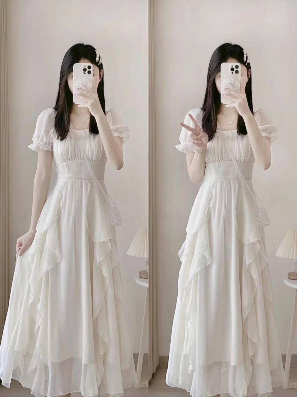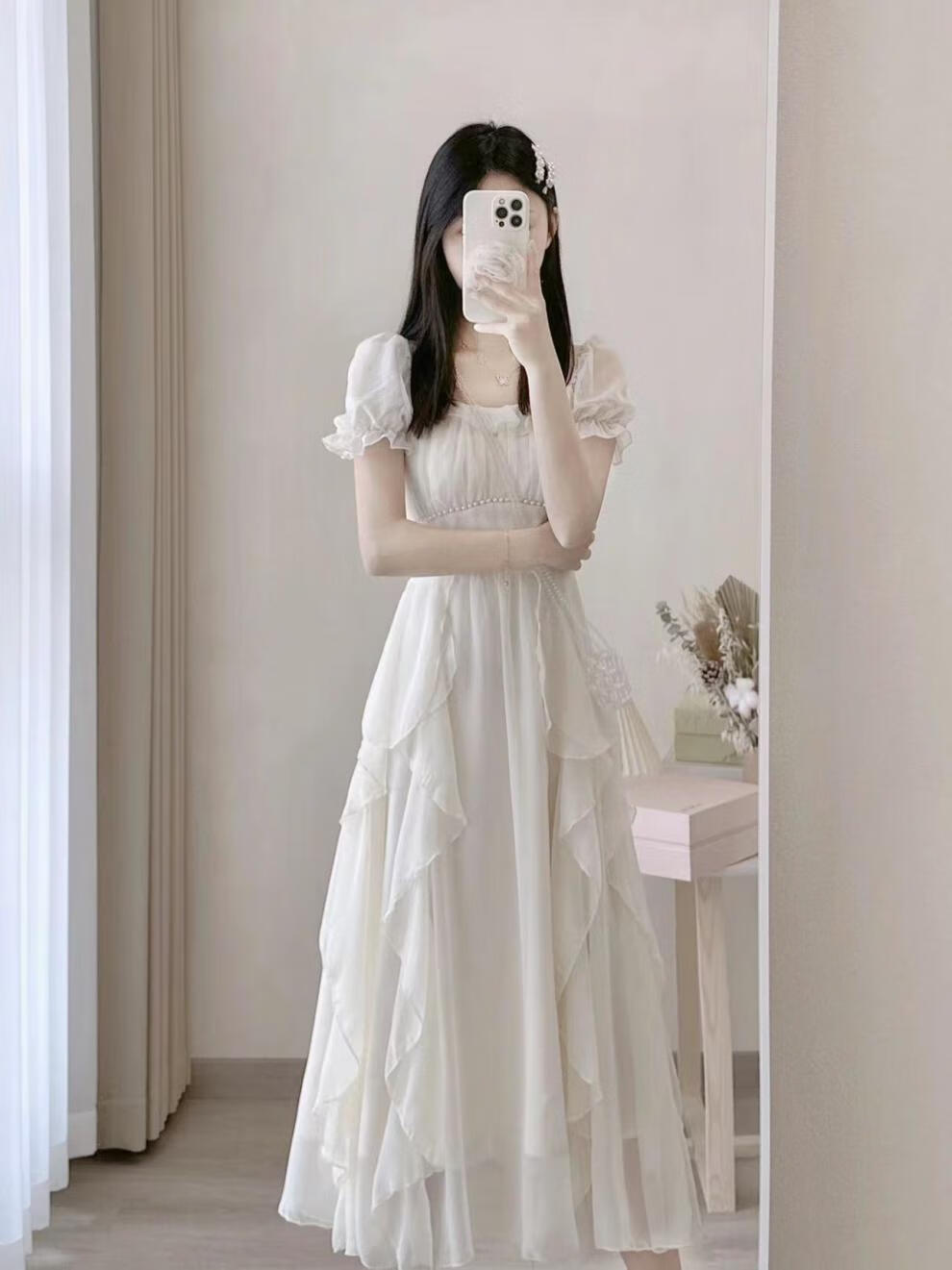 格逻恩法式连衣裙女夏季2023新款雪纺裙子夏天方领甜美温柔风仙女公主裙白色均码(可备注码数)